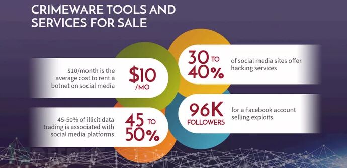 研究发现,现在多数互联网犯罪软件、工具或服务都在通过社交媒体平台来进行传播。其中,有一种类似“黑客租赁”的模式,在所有受检社交媒体网站中出现比例高达40%,黑客可帮助用户进行攻击服务、提供黑客工具、教程等,并且还会出售泄露、被盗的数据,如信用卡信息之类,该服务每年可为网络犯罪分子“创收”6.3亿美元。