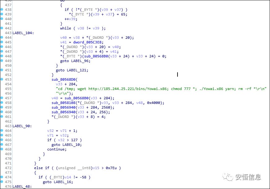当受害者存在相应的漏洞且成功执行漏洞利用代码,会利用wget命令从恶意挂马地址链接上下载病毒文件,并在本地执行,造成受害主机感染病毒: